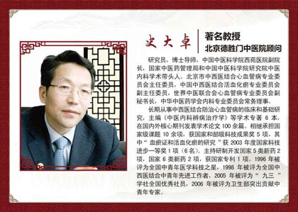 史大卓:博士导师、教授、中华中医药学会常务理事、北京德胜门中医院顾问。长期从事中医和中西医结合临床和基础一线工作,相继提出益气养阴、活血透毒、益气温阳、活血利水等疗法体系。